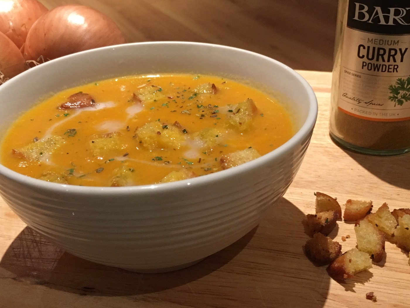 Éplucher les carottes et l’oignon, les couper en morceaux grossiers. Dans une casserole, ajouter les carottes, les oignons, le cube de bouillon, le sel, le poivre et couvrir d’eau (environ 1,5L), porter à ébullition et laisser cuire environ 30 minutes. A la fin de la cuisson, ajouter le curry, les herbes et le lait de coco (en garder un tout petit peu pour la décoration). Mixer le tout et servir accompagnée de croûtons.