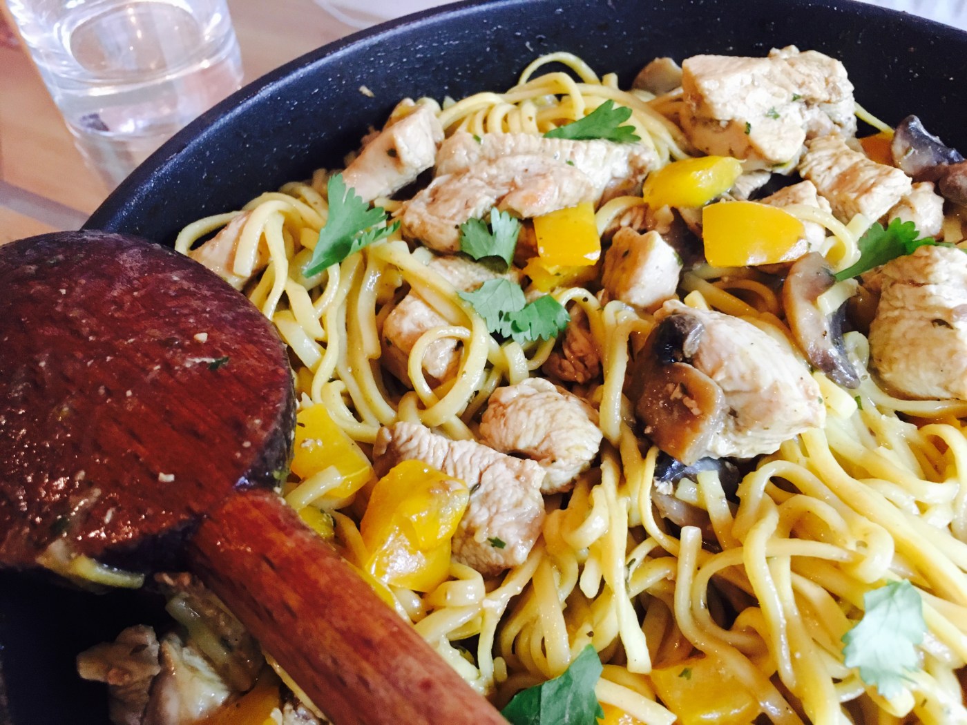 Émincer le poulet, couper les champignons en 4 et le poivron en petits carrés. Faites revenir ces trois éléments dans une grande poêle avec un peu d’huile. Saler, poivrer, ajouter 2 cuillères à soupe de sauce soja ainsi que le curry (quantité selon vos goûts, environ une cuillère à café).