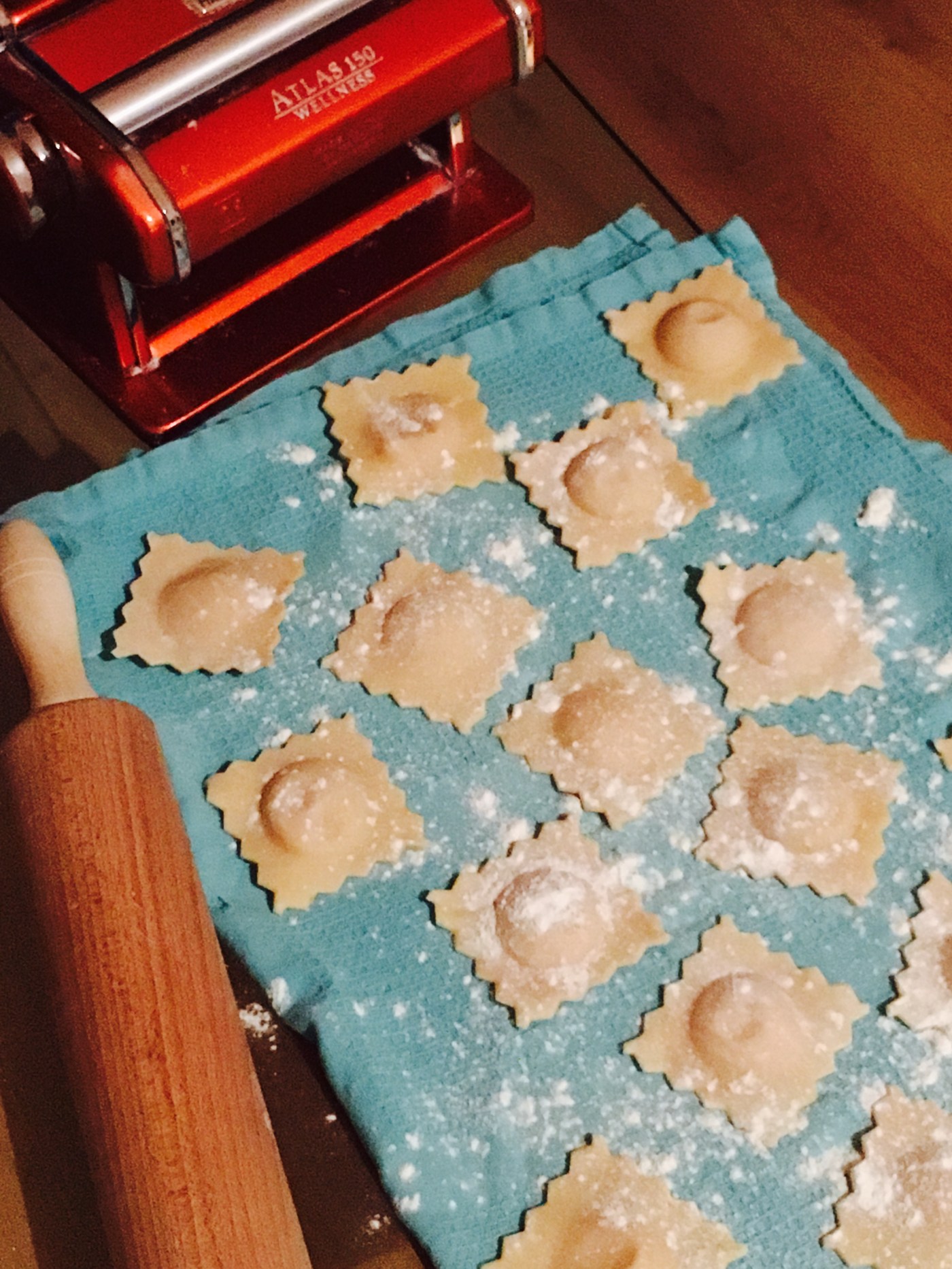 Mélanger (à la main ou au robot) la farine et les œufs jusqu’à obtenir une pâte bien homogène (environ 5-10 minutes). Passer ensuite la pâte au laminoir (environ 5 fois sur le cran 0 en farinant bien entre chaque passage) puis progressivement du cran 1 au cran 7/8 (tout dépend du laminoir). Utiliser ensuite une plaque spéciale pour découper les ravioles (disponible par exemple chez Tupperware) ou un emporte pièce. Ajouter une petite portion de farce au centre de chaque raviole avant de les refermer.