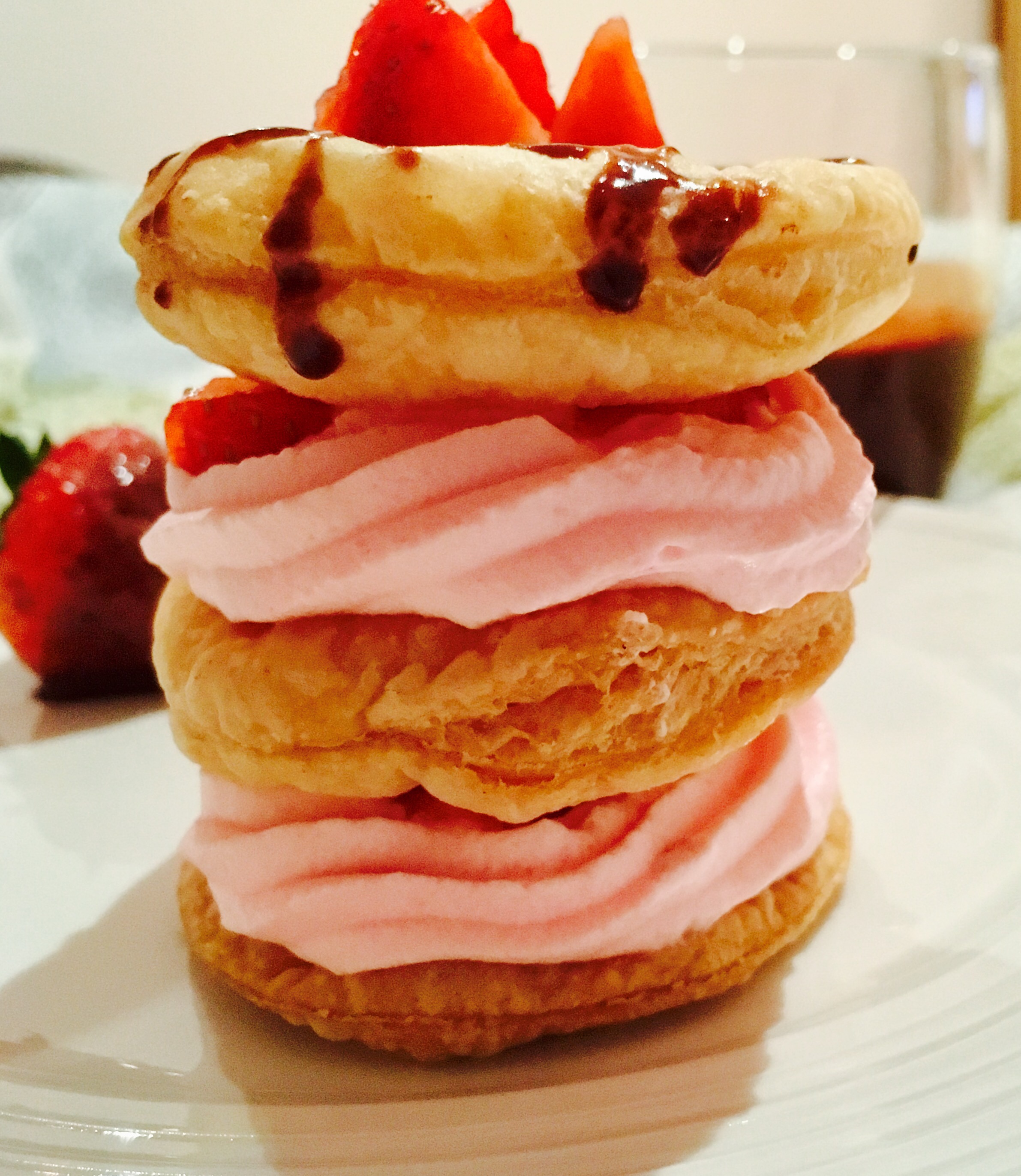 Poser un cercle de pâte feuilletée, garnir de crème chantilly et de dés de fraises fraîches, répéter l’opération pour le deuxième étage puis poser le cercle décoré de chocolat.