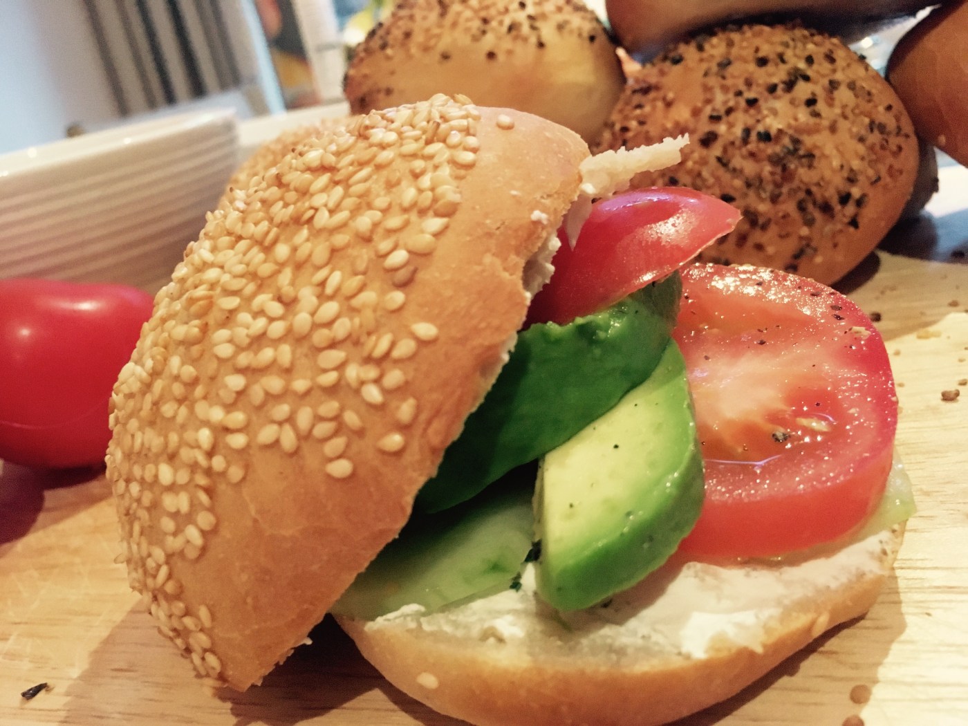 Il ne reste plus qu’à garnir ces beaux petits pains, et avec ce temps, les crudités sont les bienvenues!