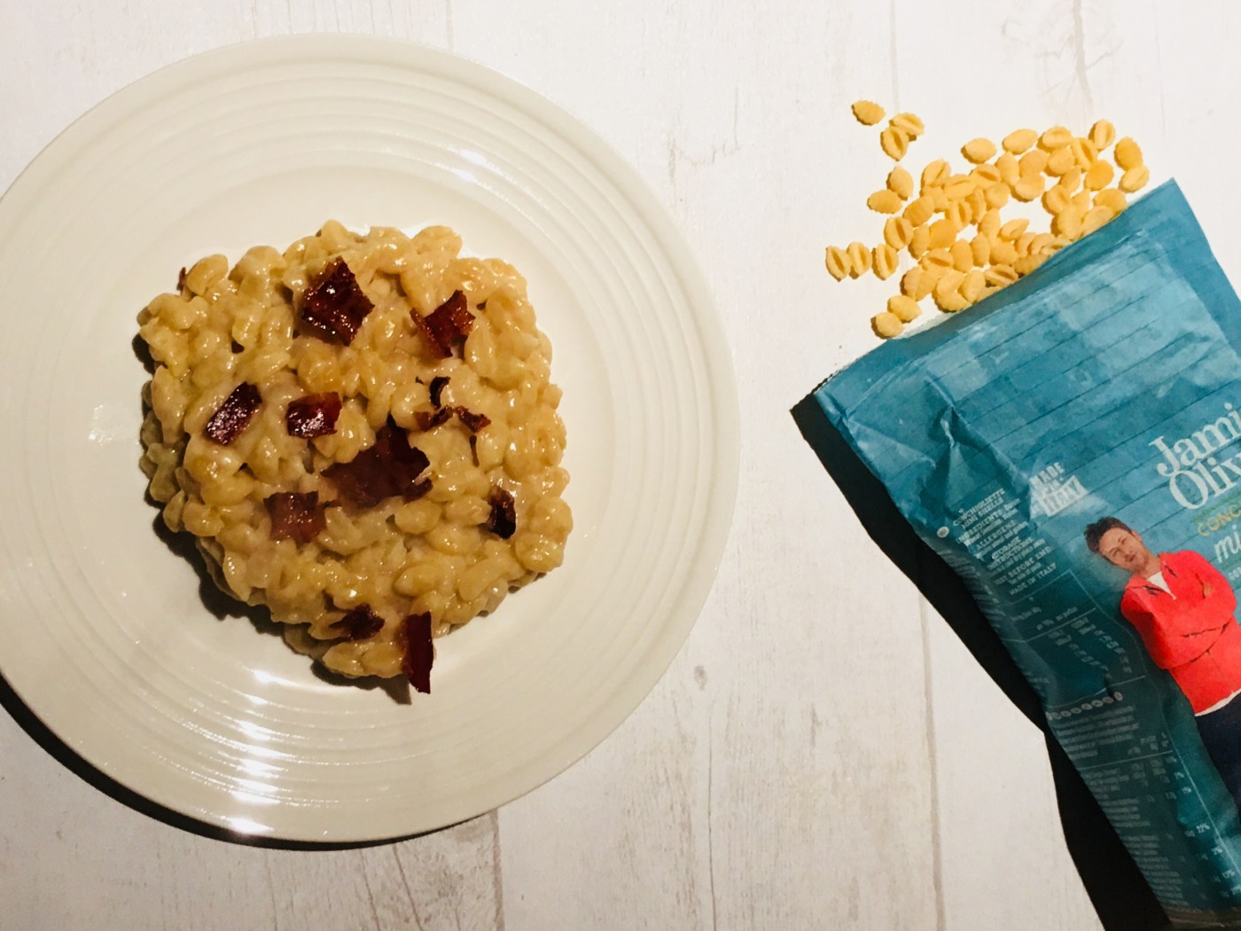 Le risotto vous connaissez et vous adorez? Pour changer, je vous propose un pastasotto crémeux et goûteux surmonté de pancetta grillée. Des petites pâtes types coquillettes ou mini conchigliettes feront l’affaire pour un repas original et aux accents italiens.
