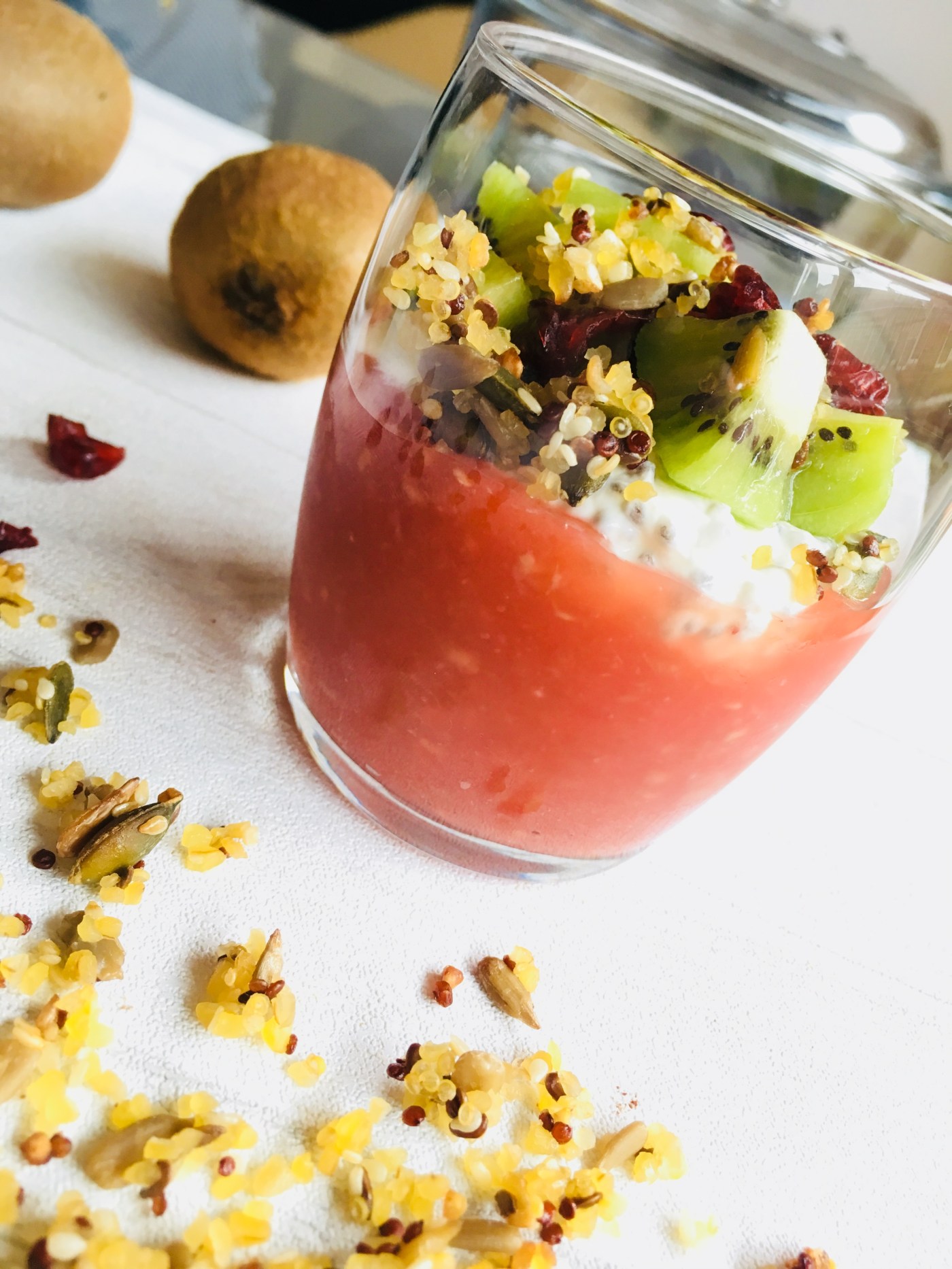 Je vous propose des verrines super gourmandes, qui peuvent avoir plusieurs déclinaisons en fonction des fruits disponibles au moment où vous vous lancez, tout au long de l’année ! J’ai réalisé une compote maison pommes-framboises, elle est surmontée de yaourt et de graines de chia, puis de fruits frais (ici, des kiwis! Je profite de la fin de l’hiver pour faire le plein de vitamine C), de cranberries séchées et de sable de quinoa et de boulgour! Ce fameux « sable » est une sorte de crumble qui ajoute un côté un peu croquant à cette recette, une vraie découverte pour moi. Le mélange des textures et des goûts est vraiment top et nous nous sommes régalés ! Ces verrines sont parfaites pour le petit-déjeuner, pleines de fibres, d’oméga-3 (grâce aux graines de chia) et de vitamines (grâce aux fruits frais).