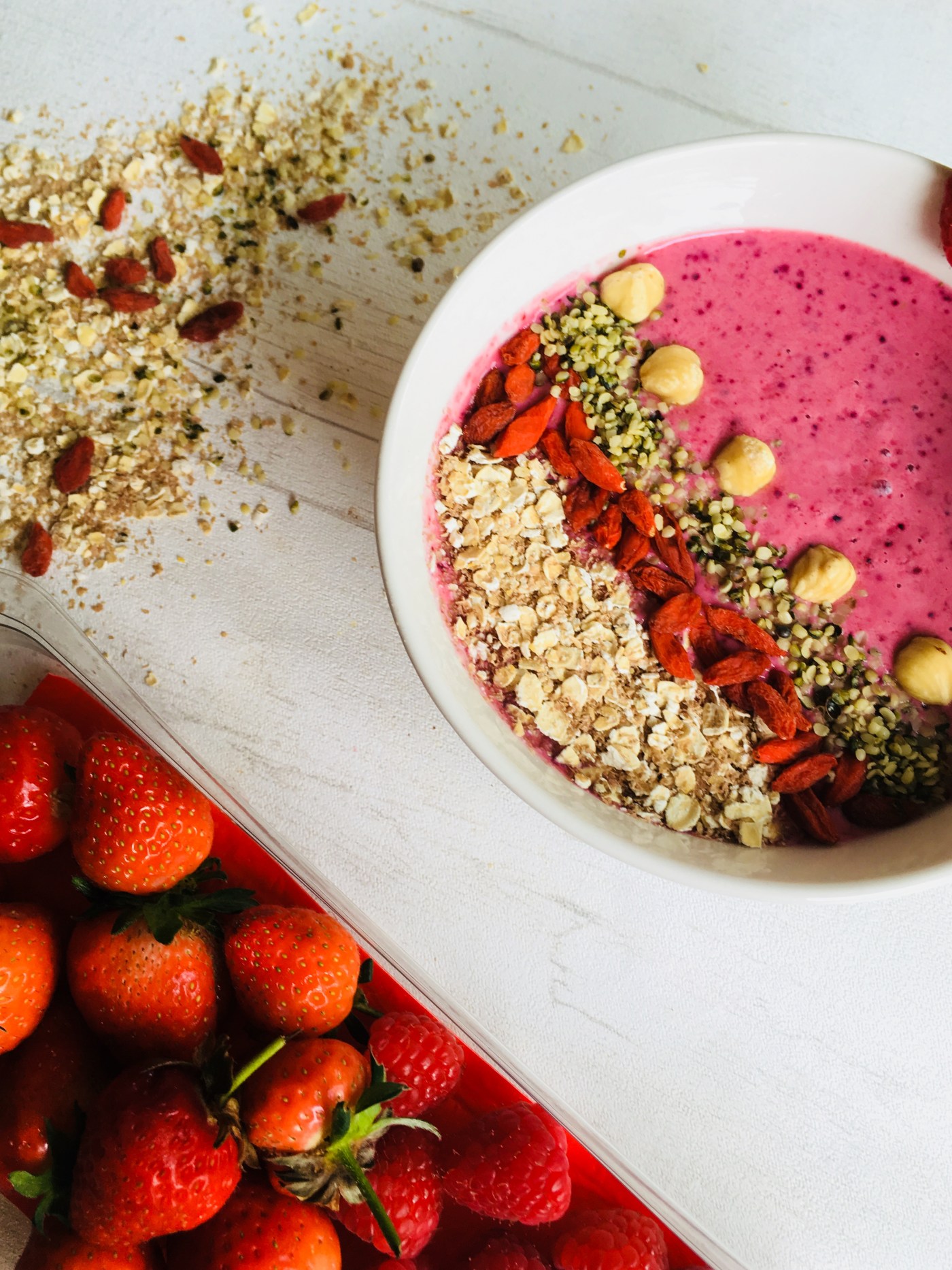 A l’occasion de ce défi, Brian iz in the kitchen nous a proposé le thème « A ras le bowl » dans lequel nous devions intégrer un aliment de saison et un super-aliment. C’est chose faite avec mon red smoothie bowl (ou plutôt pink d’ailleurs!) aux fraises, framboises et myrtilles pour faire le plein de vitamines. Pour le topping de ce smoothie-bowl, j’ai choisi l’avoine, les baies de Goji, le chanvre et les noisettes: un mélange dont les vertus sont nombreuses. Les graines de chanvre sont notamment riches en fibres et en bons acides gras comme les oméga 3 et 6; les baies de goji sont très riches en vitamines, en acides aminés et en oligo-éléments. Les flocons d’avoines ont la propriété de faire baisser le taux de mauvais choléstérol dans le sang, les noisettes, elles, apportent en plus de leurs bienfaits, un côté croquant très agréable.