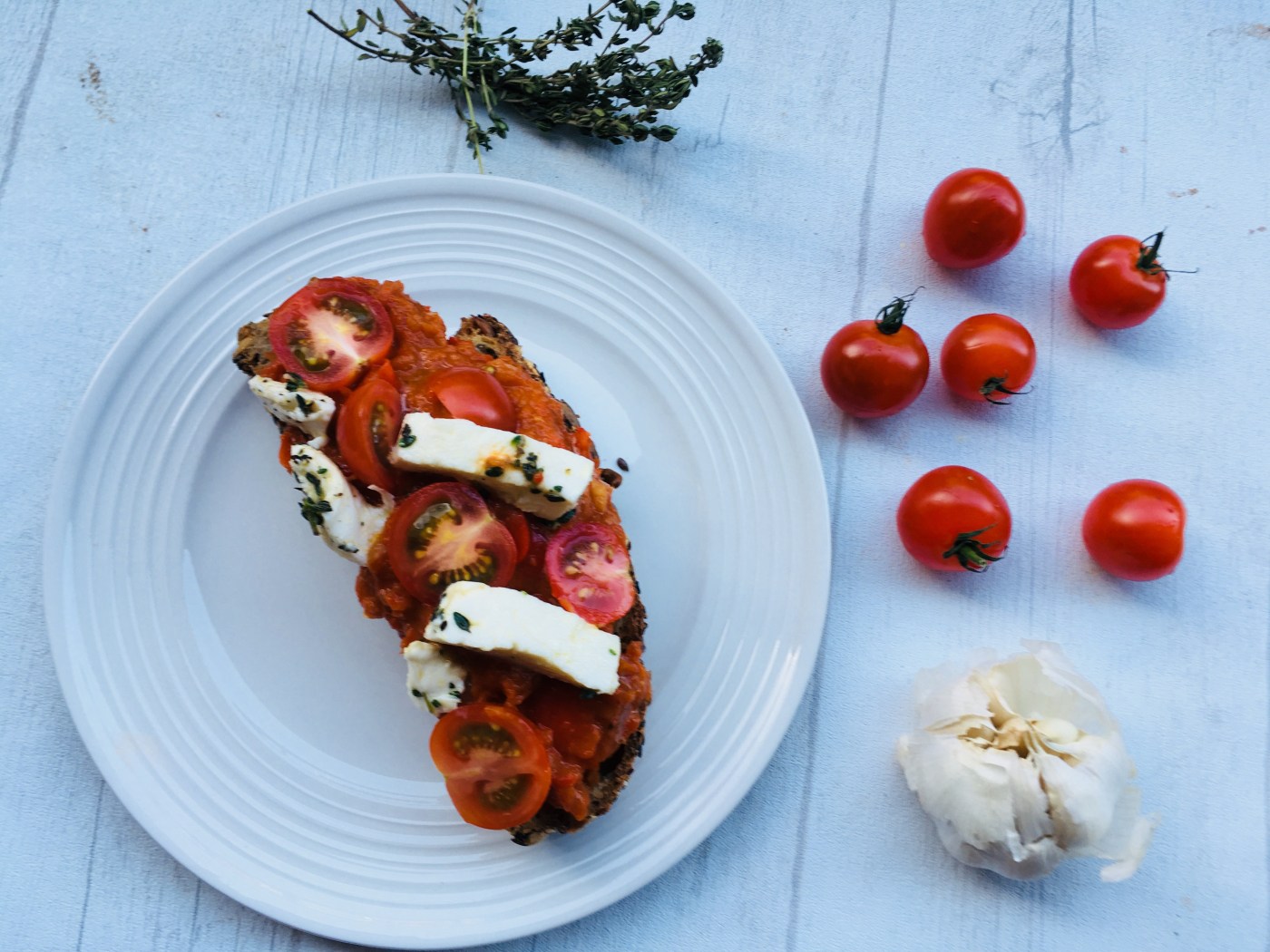 Faire griller les tranches de pain sous le grill du four. Gratter le pain chaud avec la gousse d’ail (étape optionnelle). Tartiner les tranches de crème de poivrons, disposer les tomates cerises et la mozzarella. Parsemer d’un peu de thym citron.