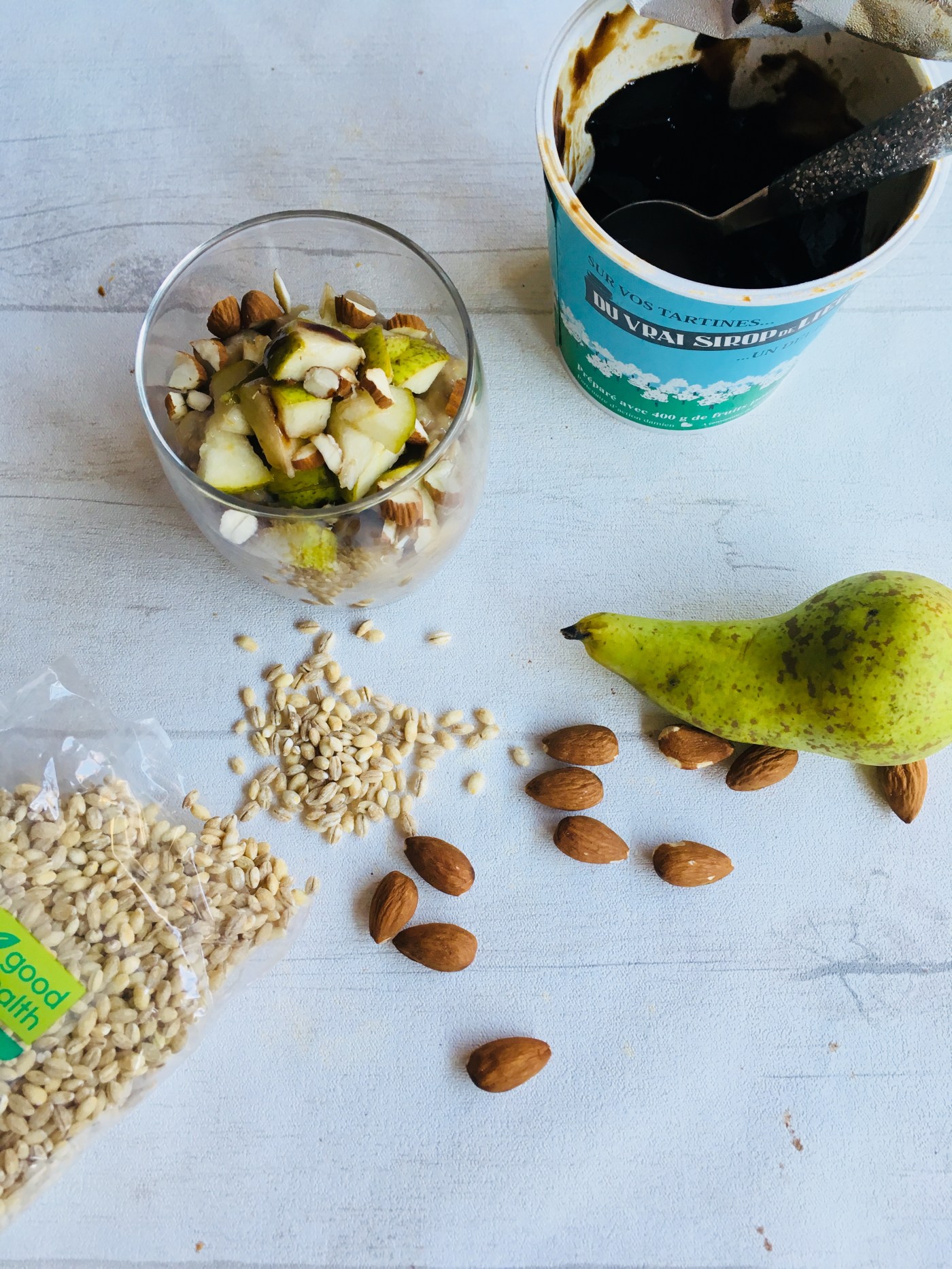 J’adore le riz au lait et vous ai déjà fait découvrir sur le blog le riz au lait de noisettes et fruits de la passion ainsi que mon classique riz au lait et pistaches caramélisées. Aujourd’hui, recette régressive et retour en enfance garanti! Le riz a fait place à l’orge perlé, le lait de vache au lait d’amandes et le tout est servi avec des poires, des amandes et du sirop de Liège! J’aime vous proposer des recettes adaptables, celle-ci en est un bel exemple: vous pouvez utiliser le « lait » que vous souhaitez (avoine, riz, coco…) mais également personnaliser ces verrines avec les fruits de saison que vous avez chez vous. Le sirop de Liège est également remplaçable par du miel ou du sirop d’agave, bref, amusez-vous! Avec l’orge, cette recette demande un peu d’anticipation car elle nécessite de le faire tremper 12h (ou un peu moins, ça fonctionne aussi…) avant de débuter la cuisson.