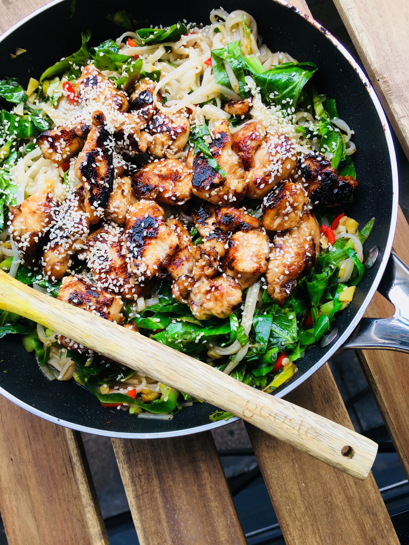 Ajouter le mélange de sauce que vous avez réservé en début de recette dans la poêle avec les légumes, ajouter les nouilles et bien mélanger. Ajouter le poulet cuit et le sésame.