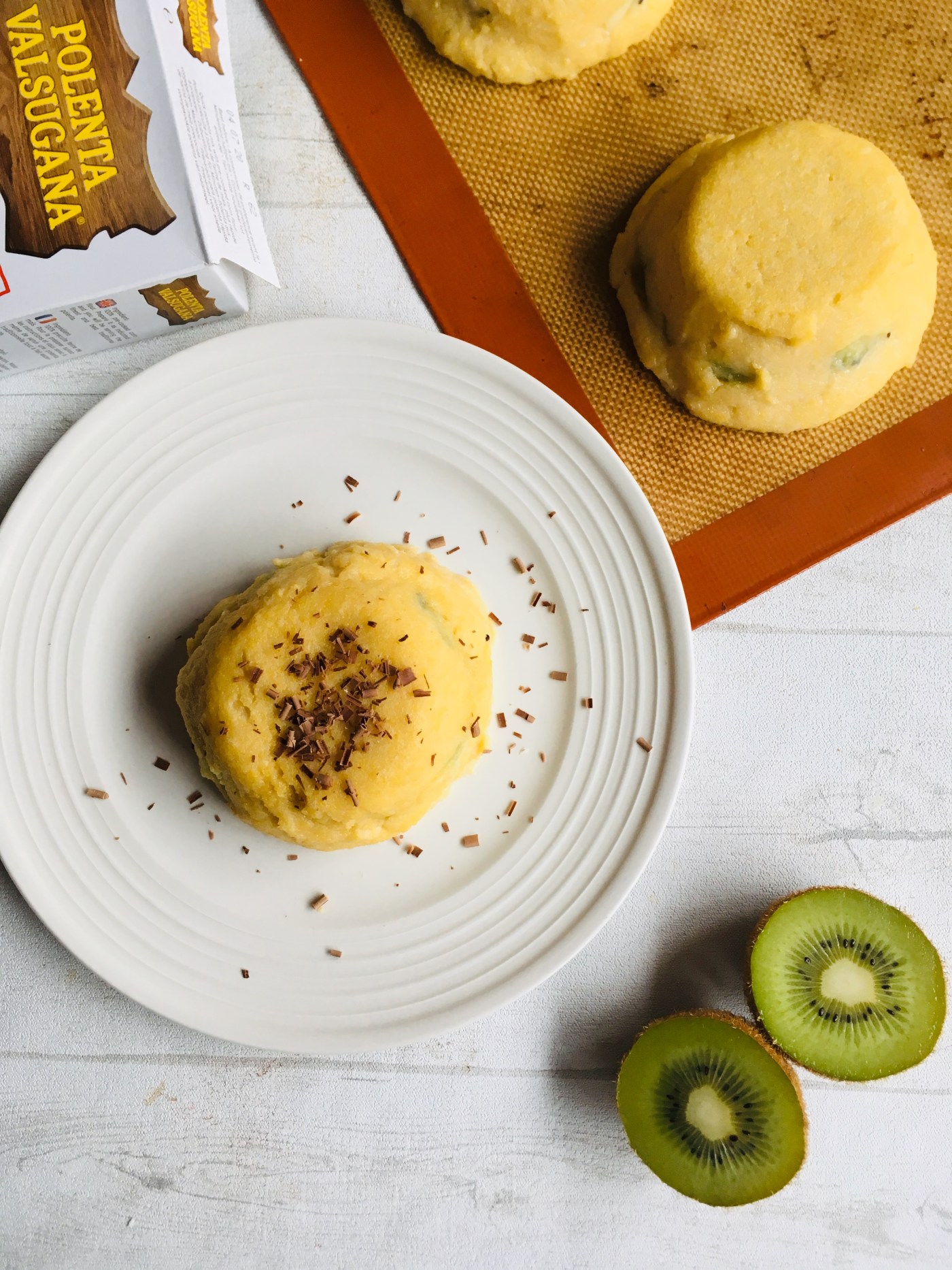 Verser la moitié de la préparation dans 4 moules à muffins (10cm). Ajouter les dés de kiwis puis recouvrir du reste de polenta. Lisser la surface à l’aide d’une spatule.