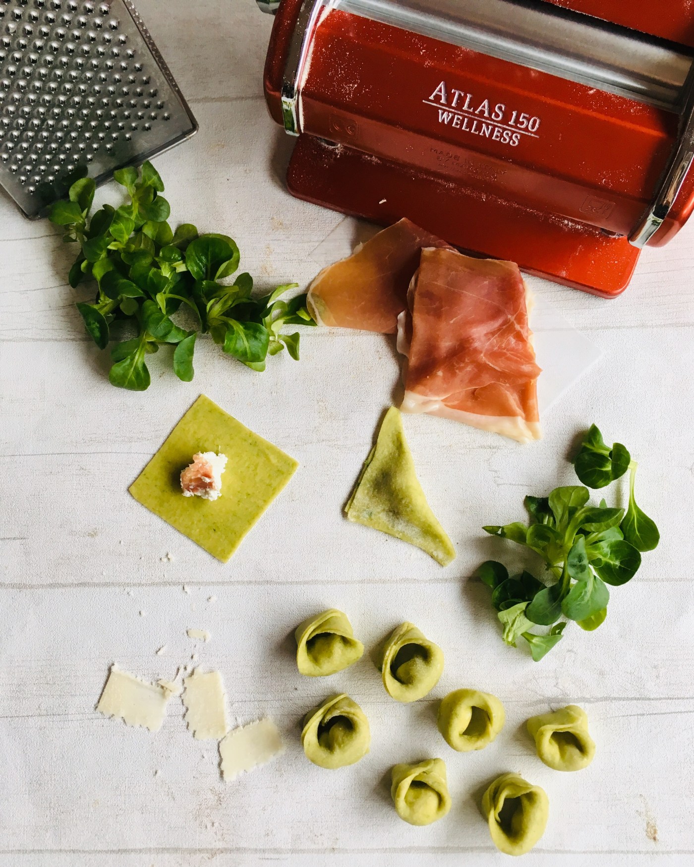 Pour la pâte à pâtes fraîches vertes et le façonnage des tortellinis (Temps de préparation: 5 minutes; Temps de repos: 30 minutes; Temps de façonnage: 20 à 30 minutes; Temps de cuisson: 2 minutes):