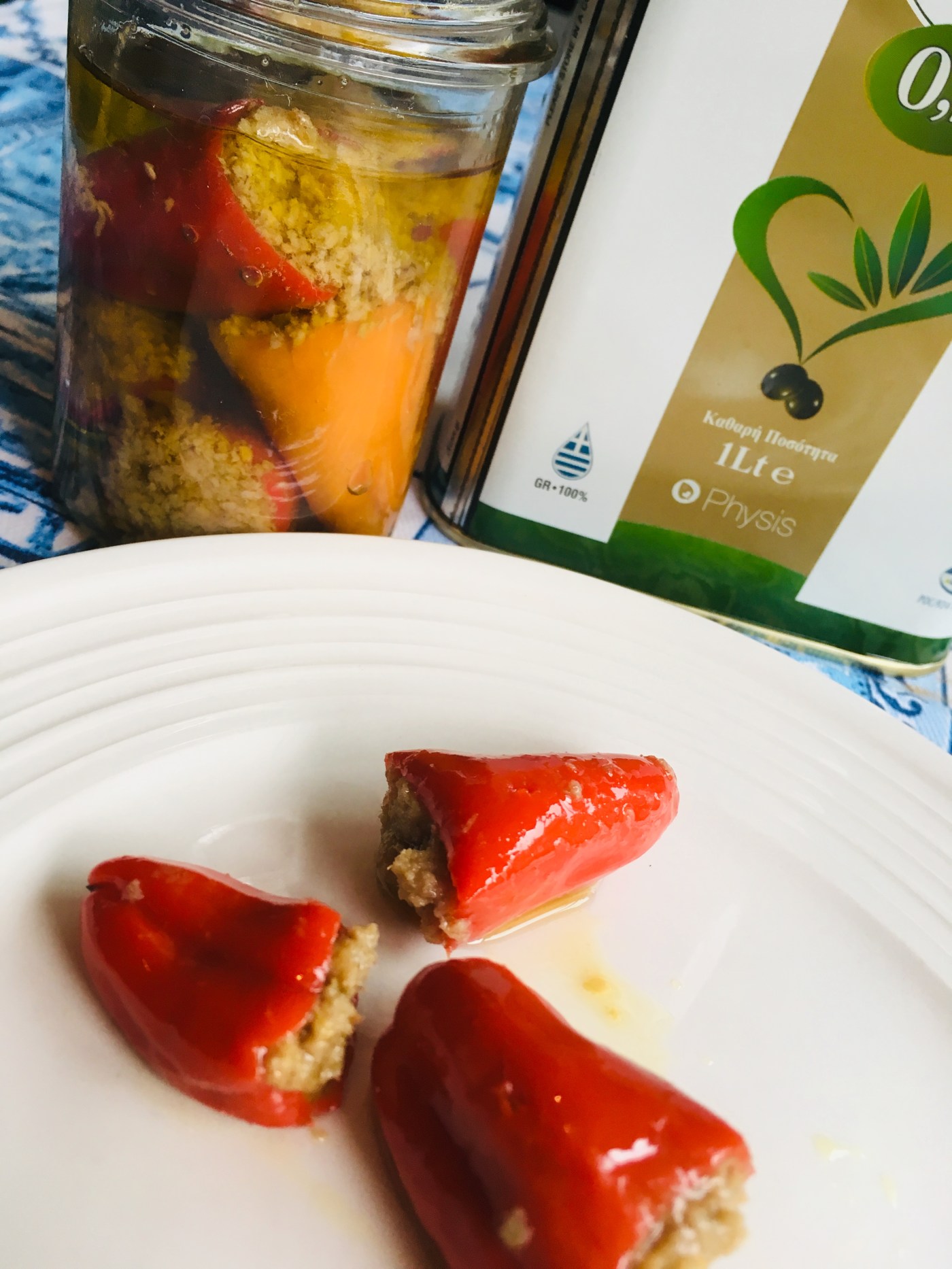 Farcir les poivrons avec cette préparation. Disposer les poivrons dans des pots stérilisés au préalable, ajouter les gousses d’ail (une par pot, coupées en deux), recouvrir le tout d’huile d’olive et fermer.