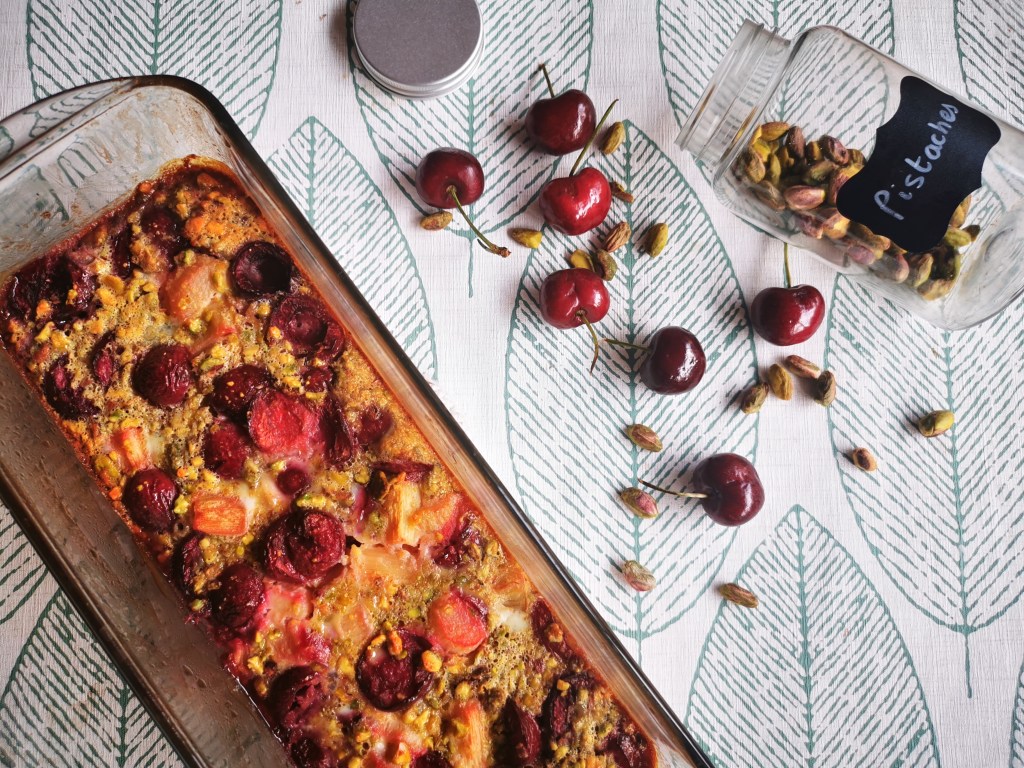 Je vous présente notre dessert de ce week-end, un clafoutis très fruité à la cerise, à la rhubarbe et aux pistaches. Autant vous dire que nous nous sommes régalés avec ces bons fruits de saison.