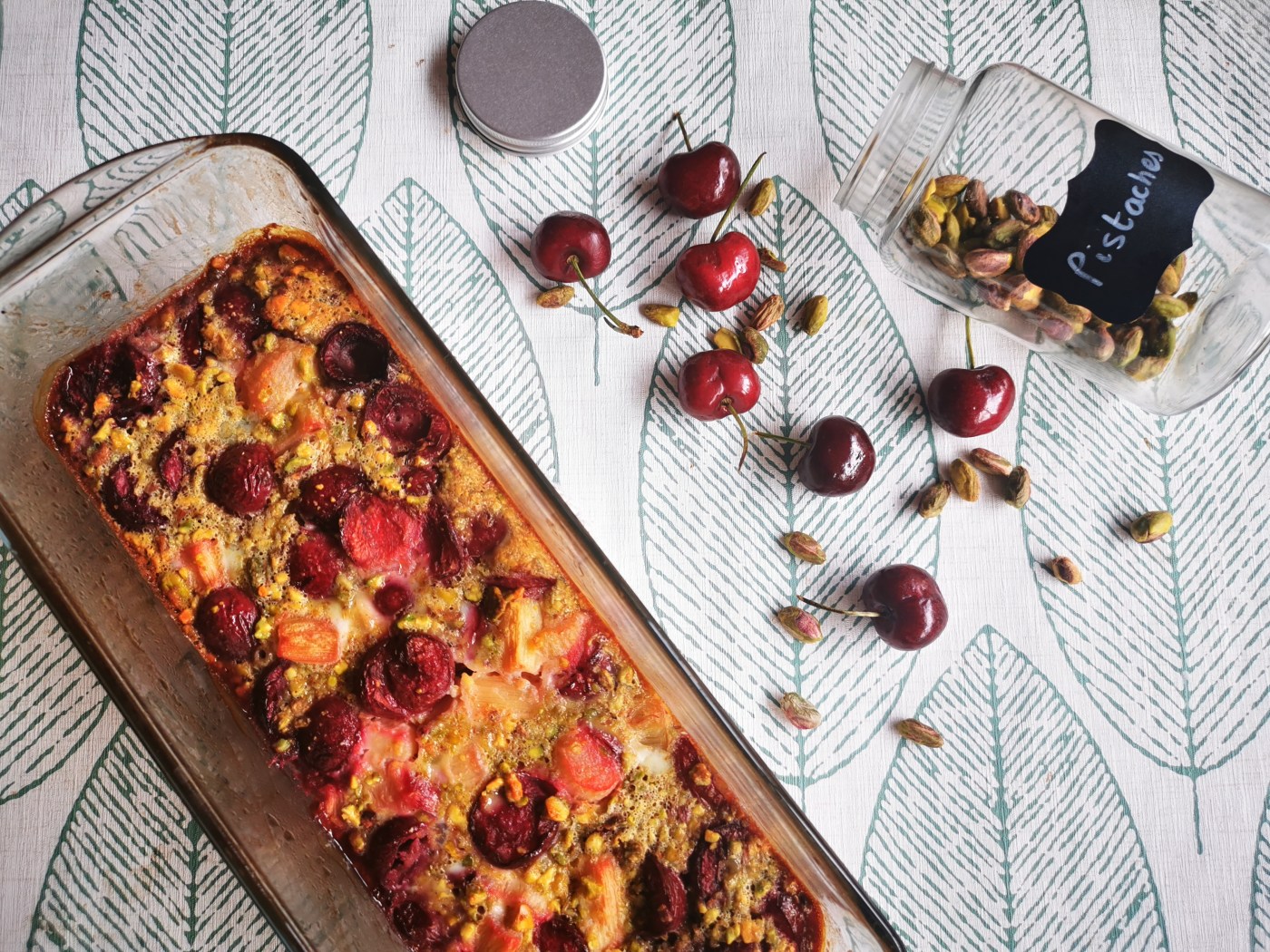 Je vous présente notre dessert de ce week-end, un clafoutis très fruité à la cerise, à la rhubarbe et aux pistaches. Autant vous dire que nous nous sommes régalés avec ces bons fruits de saison.