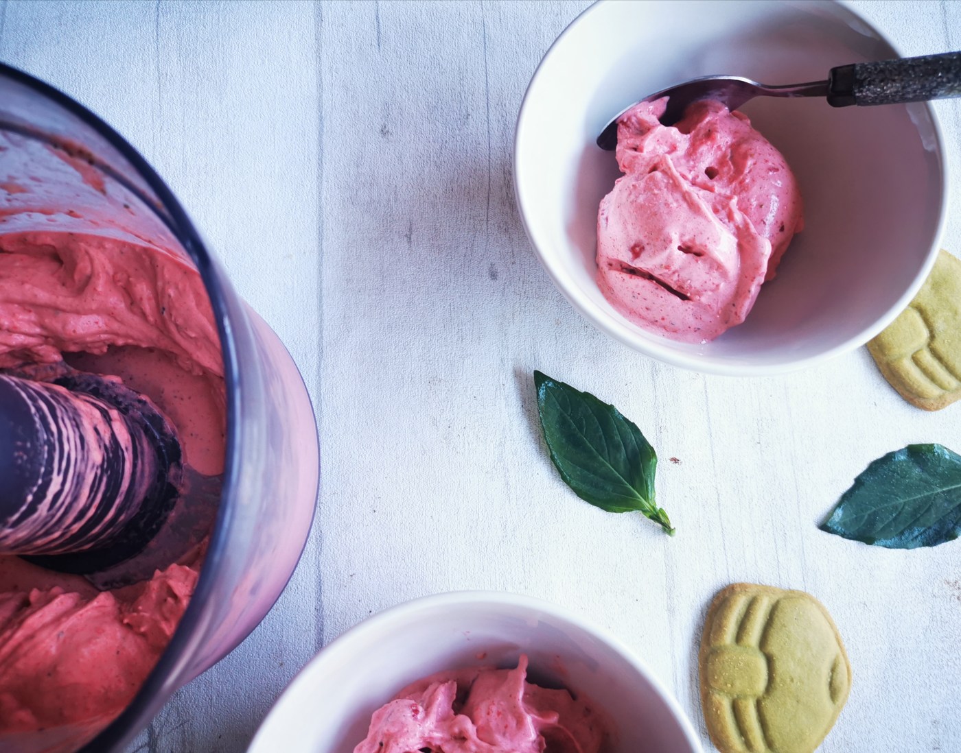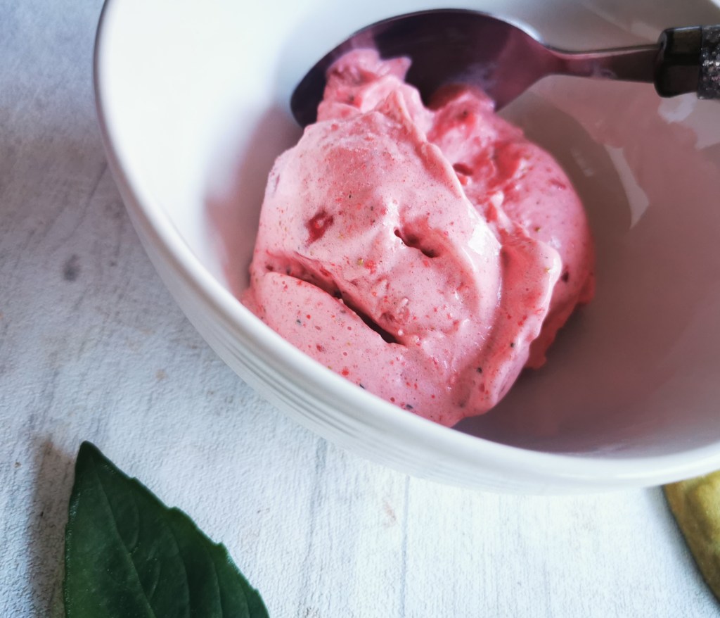 Une envie de dessert qui change et qui se prépare en moins de 10 minutes top-chrono ? J’ai eu l’idée de ce sorbet minute aux fraises et au basilic après avoir trouvé des fraises au rabais au supermarché car leur date de péremption était imminente. Ni une, ni deux, elles avaient trouvé preneur! Coupées en morceaux et placées au congélateur, elles n’attendaient plus que nous les dégustions dans ce sorbet délicieux. Servi avec un petit biscuit en forme de yourte (ramené de mes récentes aventures en Mongolie), impossible d’y résister!