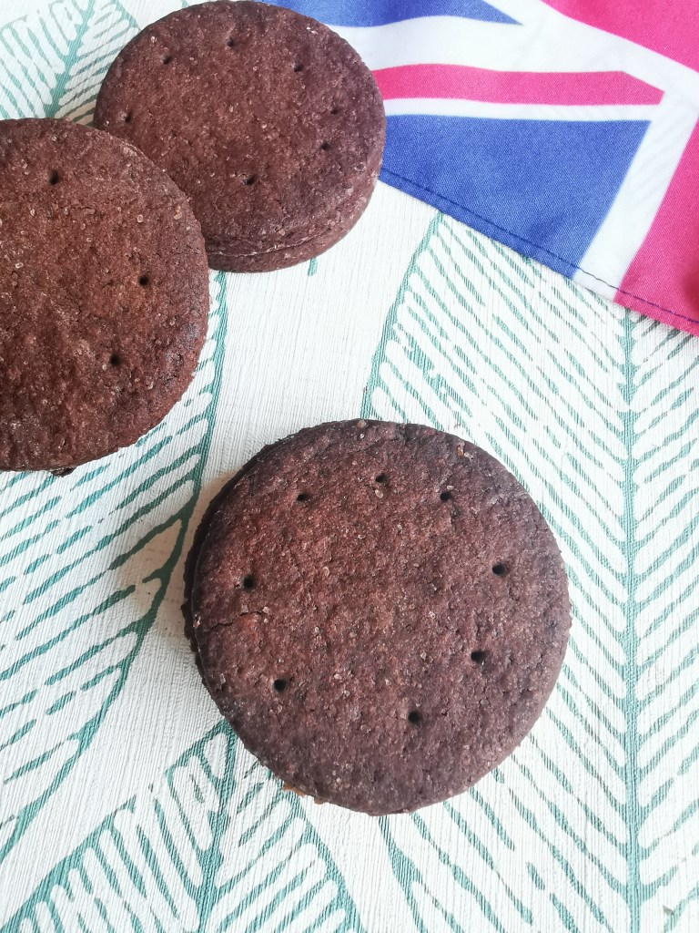 Nous nous sommes éloignés de l’Angleterre pour les vacances mais sommes rentrés avec une petite cargaison de biscuits bourbon pour les ami(e)s accros. Ces biscuits typiquement anglais sont dans le top 5 des biscuits favoris de nos voisins britanniques pour accompagner le thé, c’est dire à quel point ils sont appréciés. Leur nom n’a rien à voir avec le whisky éponyme mais fait référence à la famille Bourbon (un nom royal et Frenchy donné dans les années 1930, c’est plus vendeur!). Ces biscuits sont traditionnellement de forme rectangulaire, je me suis permis une petite entorse à la tradition ! Ils sont fourrés d’une ganache au chocolat, régressif à 100%. Voici la version « home-made »:
