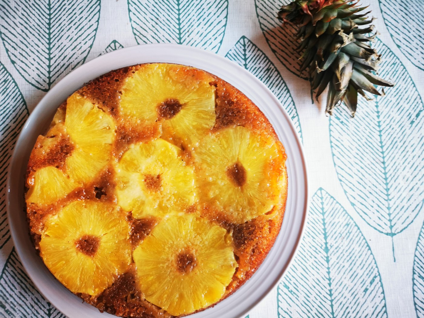Répartir ce mélange au fond d’un moule rond de 25cm de diamètre. Recouvrir des tranches d’ananas.