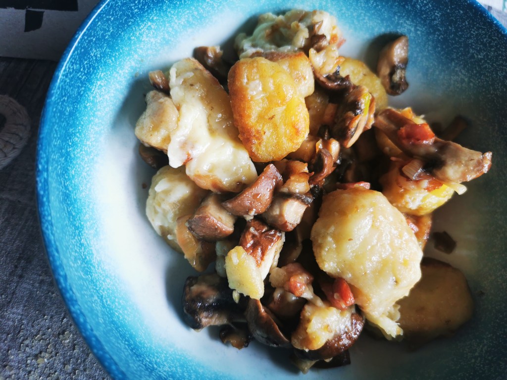Gnocchis maison gratinés à la pancetta et aux champignons