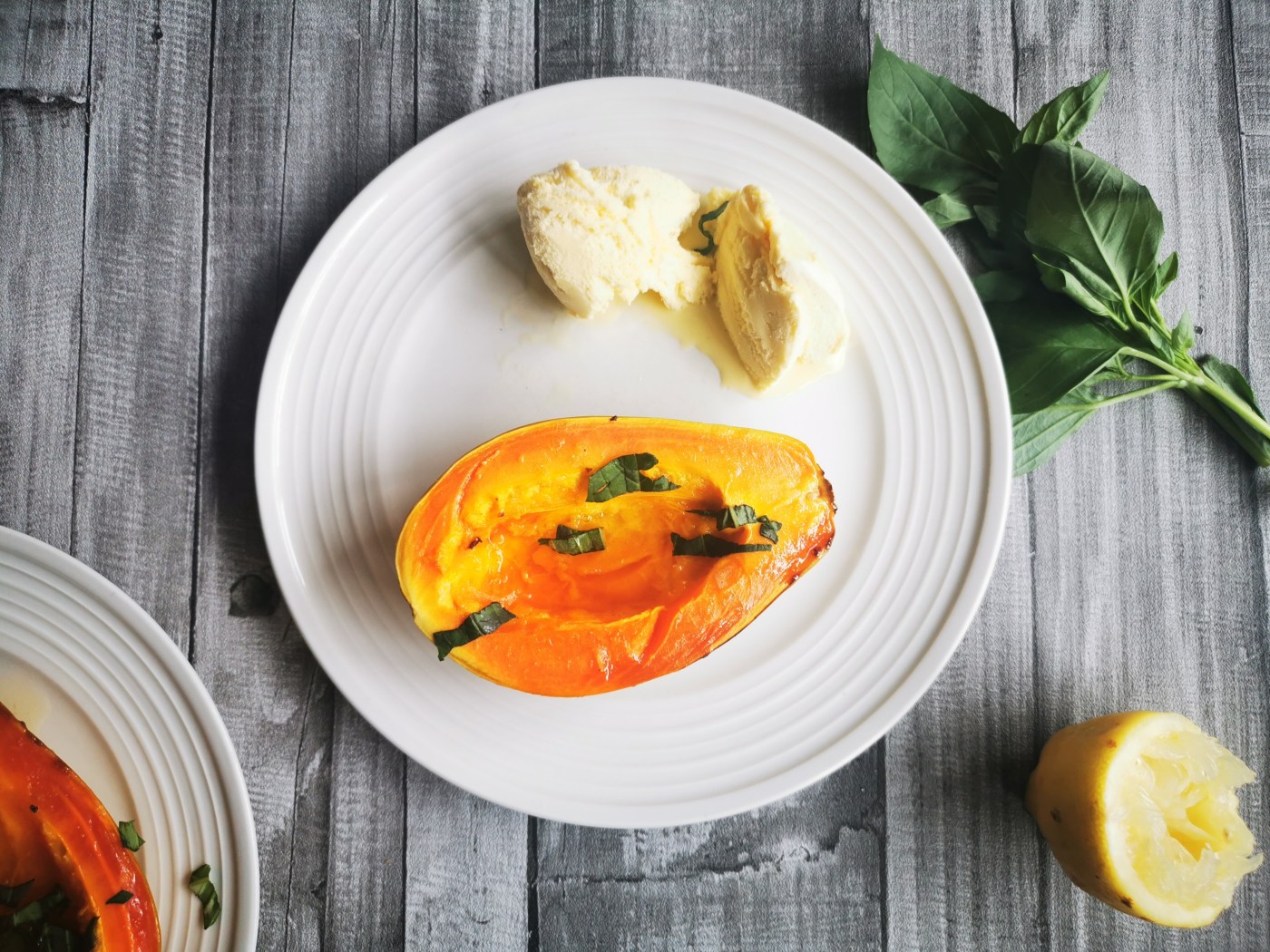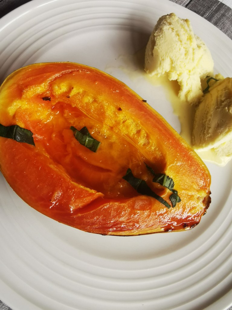 C’est la pleine saison de sa dégustation alors on en profite pour préparer cette recette de papaye rôtie au citron vert et au basilic. Servie avec une belle boule de glace vanille, c’est un délice.