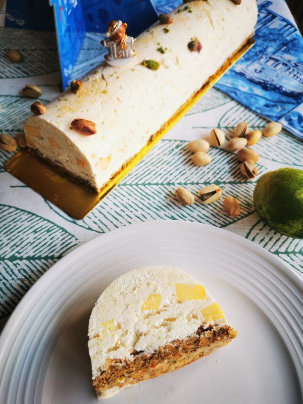 Bûche chocolat blanc, citron vert et mangue, biscuit à la pistache