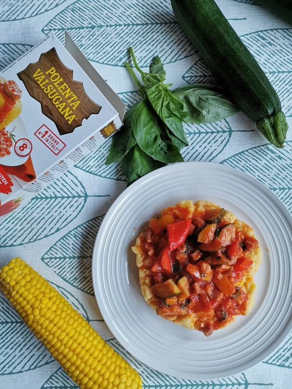 Polenta, maïs et compotée de courgettes et poivrons à la pancetta