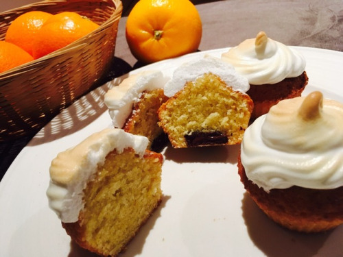Impossible de se passer de cupcakes lorsque l'on vit dans un pays anglophone! Ces petits cupcakes meringués à l'orange m'ont séduite: tous doux et tous moelleux, avec une pointe de pep’s apportée par l'orange. J'ai également ajouté un cœur fondant au chocolat pour certains et alors là…c'est parfait!